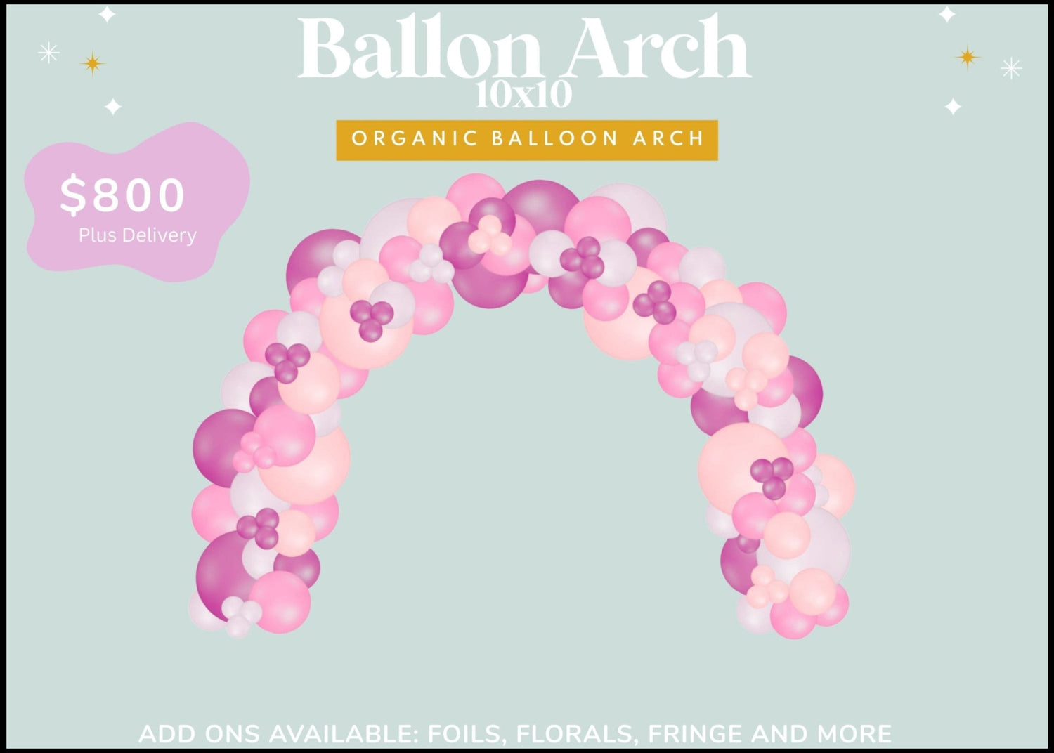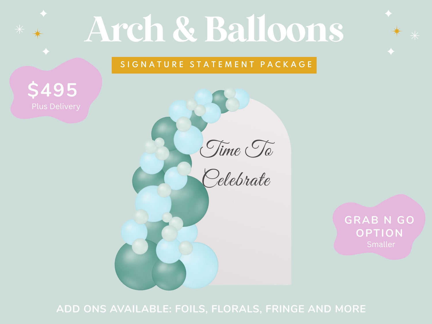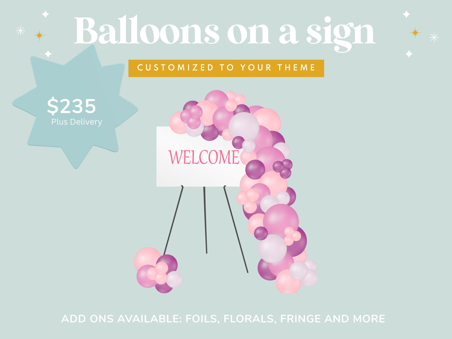 Features a 6-ft arch board styled with 12 feet of organic balloons and custom vinyl lettering. 🎈✨